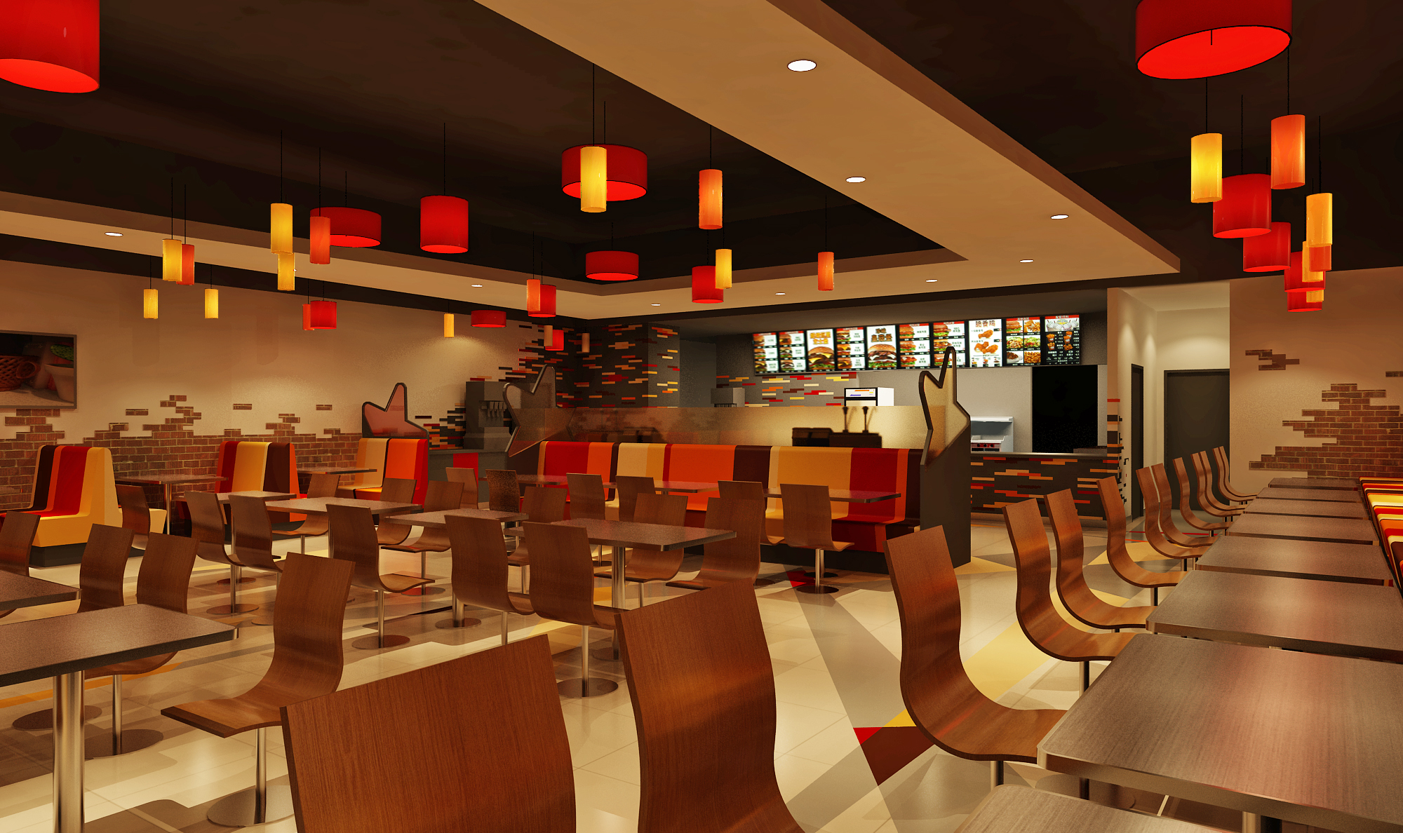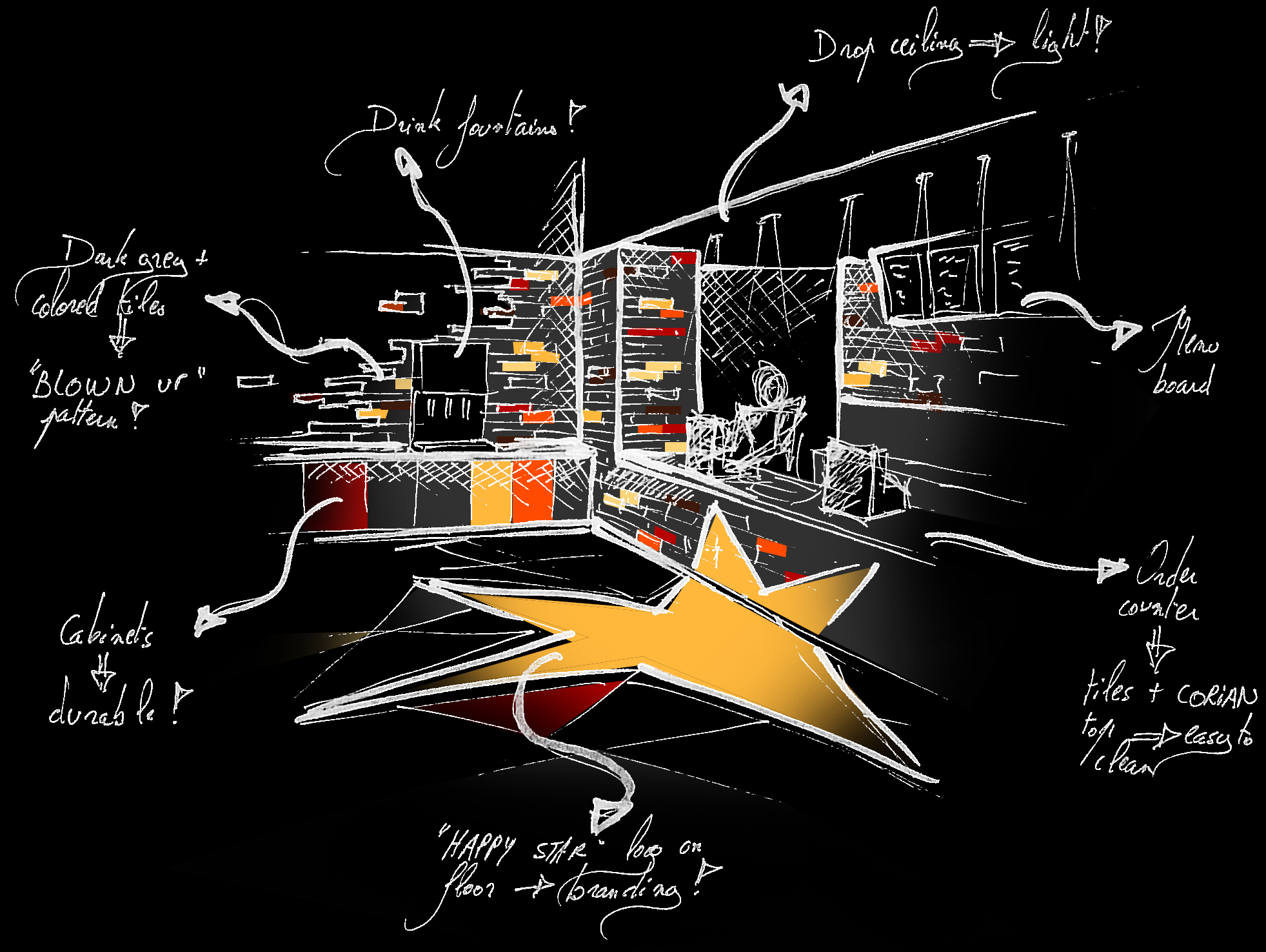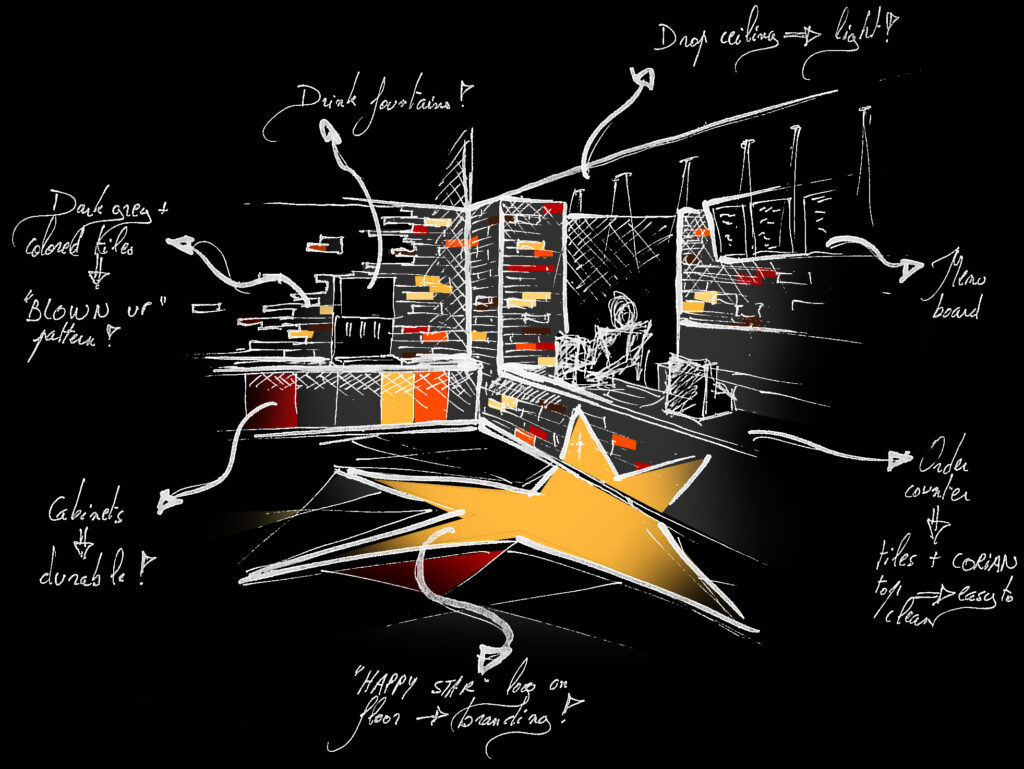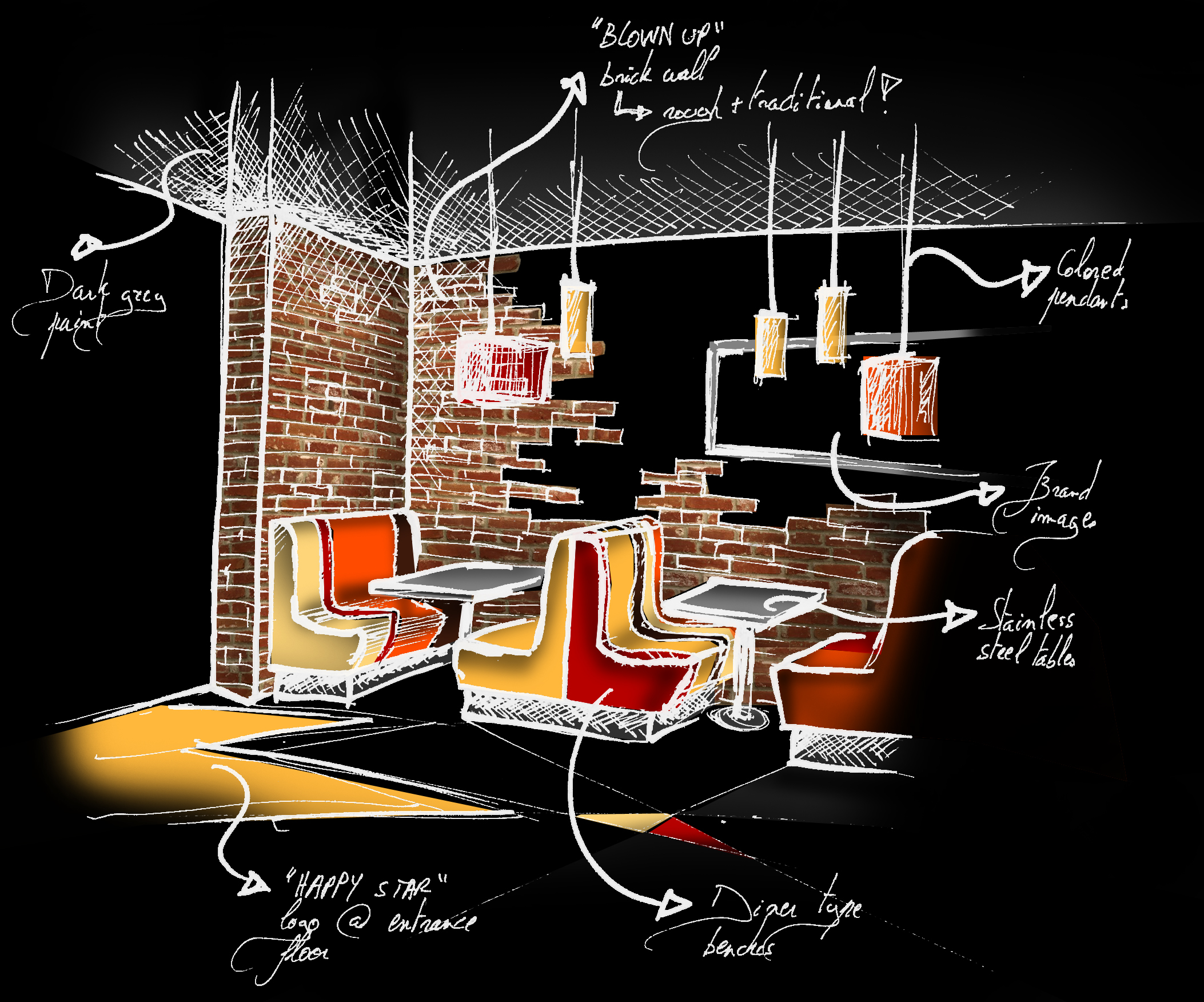 My first task was to identify a brand relevant and locally appealing story for the store concept. Based on my research I identified a notable contrast in the brand’s communication strategy between its traditional chargrilled burger offer and the rather “in your face” advertising campaigns running at the time, most notably that featuring Paris Hilton in a swimsuit. Based on this unique mix, I suggested a design applying visual codes traditionally associated with American diners but addressing them in a more explosive manner.