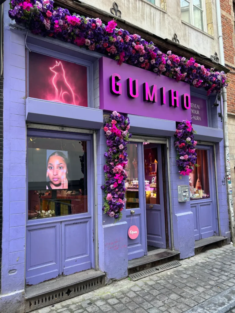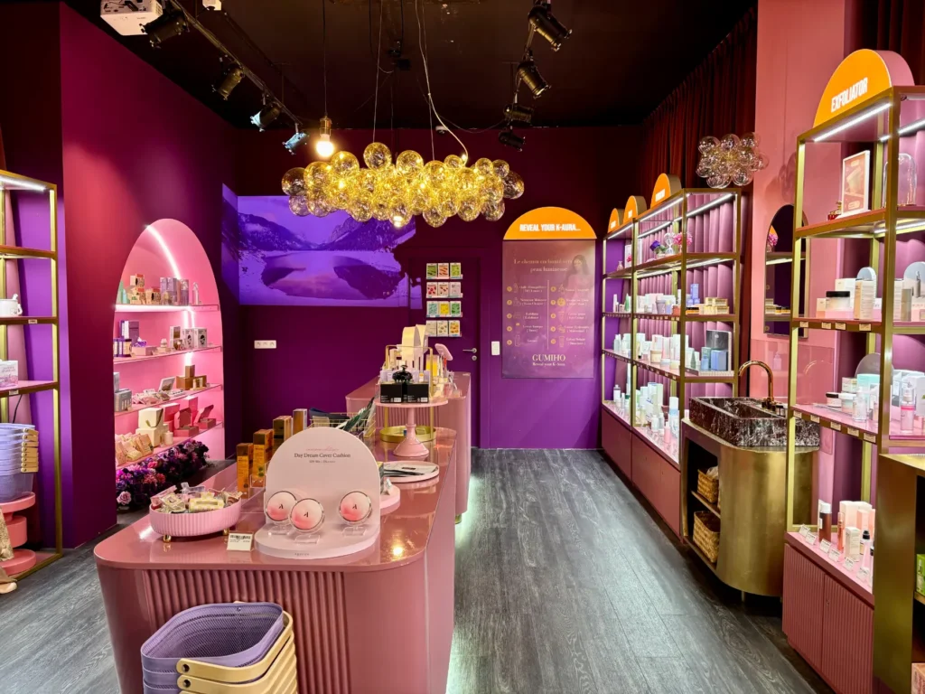 Gumiho was developed by its passionate owner to share the virtues of Korean beauty alongside the richness of Korean culture with the European audience. The retailer’s ambition at the time of consulting me was to open a first shop in Brussels which, if successful, could easily be replicated across Belgium and then further abroad. She had already defined a very clear offer focusing on the K-beauty ritual, complemented with gifts, food and drink, and had worked hard on an initial brand identity scheme anchored in soft refinement and mysticism. Additionally, she had also reflected on the intended store experience and designed herself a couple of AI renders of this one.