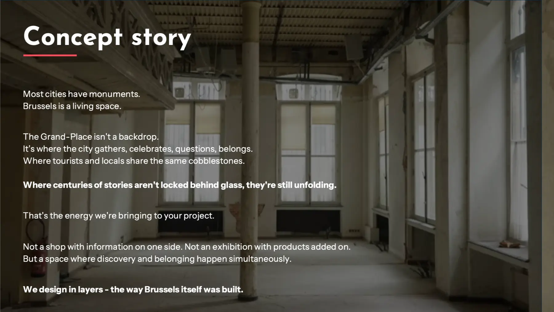 The call for application provided the following brief: “Conceived as a multifunctional venue, the visit.brussels shop will combine a retail area, a visitor reception space, cultural mediation features, and a permanent exhibition on the history of the Grand-Place. The design must combine sobriety, functionality, and respect for the heritage context, while remaining adaptable to multiple uses: group visits, children’s zone (including bespoke, child-height furniture), accessibility for people with reduced mobility, etc. The City Hall of Brussels is fully classified as a heritage building. The project must therefore be designed without any permanent fixings to the walls, floors, or ceilings. Any future modification will require a planning permit.”